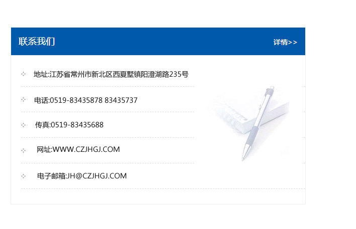 地址:常州市新北區友邦商務大廈1幢16、17層  電話:0519-85101652  傳真:0519-85112595  郵編:213022  網址:www.cz-jiayue_cn.qingshengboli.com  郵箱:xiajifengaa@163.com